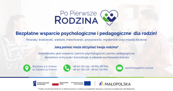 Projekt „Po Pierwsze Rodzina” oferuje bezpłatną pomoc psychologiczną i pedagogiczną dla rodzin zamieszkujących powiaty: krakowski, wielicki, miechowski, proszowicki,... -