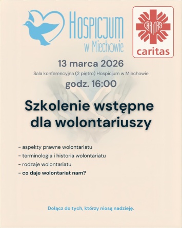 Hospicjum w Miechowie zaprasza osoby zainteresowane działalnością wolontariacką do udziału w szkoleniu wstępnym, które odbędzie się 13 marca 2026 r. o godz. 16:00 w sali... -